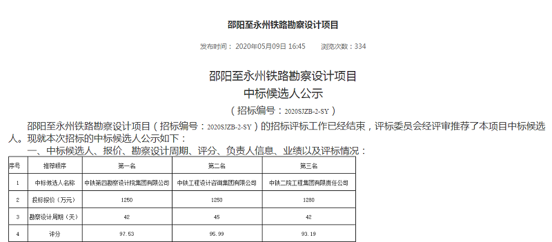 5月9日,國鐵集團發(fā)布邵陽至永州鐵路勘察設計項目中標候選人公告: