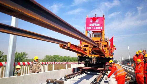 4月15日上午9時(shí)28分,在北京至雄安新區(qū)城際鐵路李營段施工現(xiàn)場,隨著中鐵十二局集團(tuán)現(xiàn)場指揮人員一聲令下,第一組500米長鋼軌從T11運(yùn)輸車前端緩緩送出,平穩(wěn)落在無砟道床上,標(biāo)志著京雄城際鐵路建設(shè)整體從線下施工轉(zhuǎn)入線上軌道鋪設(shè)階段,也意味著獻(xiàn)禮新中國成立70周年的京雄城際鐵路(北京段)的開通運(yùn)營進(jìn)入最后沖刺階段。