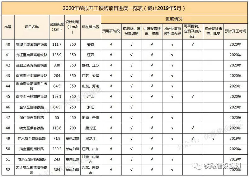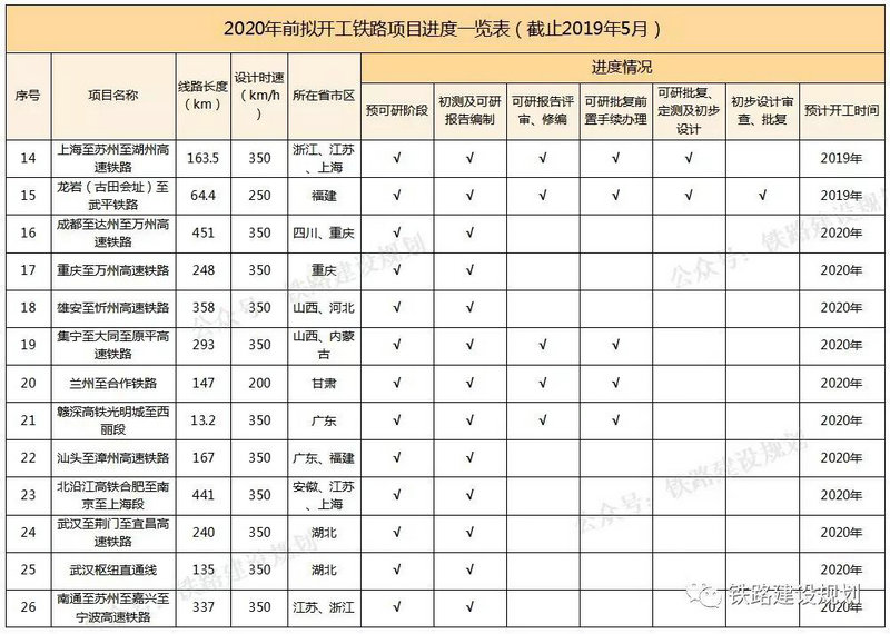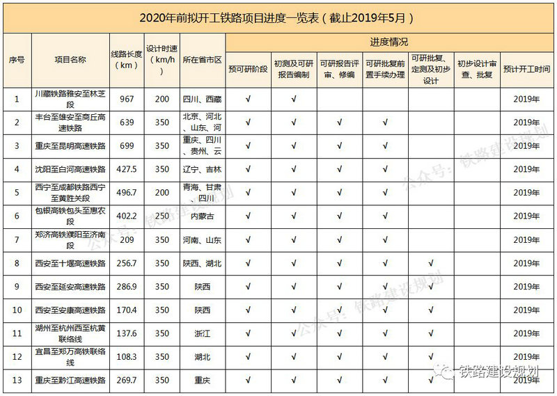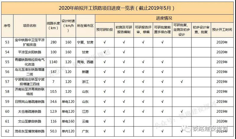 根據2019年鐵路總公司鐵路基本建設計劃以及各省、市、區(qū)鐵路重點建設項目名單,結合“十三五”鐵路規(guī)劃,收集、整理并匯總了2020年前(“十三五”規(guī)劃期內)擬開工建設鐵路進度一覽表,僅供參考。